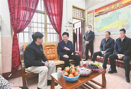 春节前夕,自治区主席蓝天立来到防城港市,深入医院、学校、企业等,看望慰问疫情防控一线工作人员、优秀楷模、优秀党员和科技人才。在全国优秀共产党员、83岁高龄的黄永腾家里,蓝天立关切询问他的生活情况,希望他继续引导青少年树立正确的人生观价值观,让红色基因代代相传。