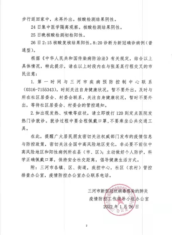 原标题:廊坊三河公布一例确诊病例行动轨迹