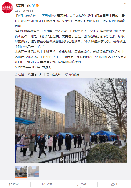 此前报道:河北燕郊多个小区已封控 居民排队等待做核酸检测(北京青年报)