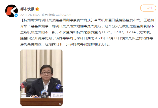 杭州确诊病例甘某某经基因测序系奥密克戎