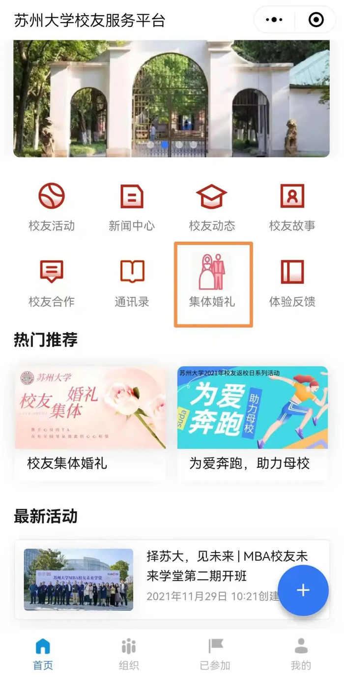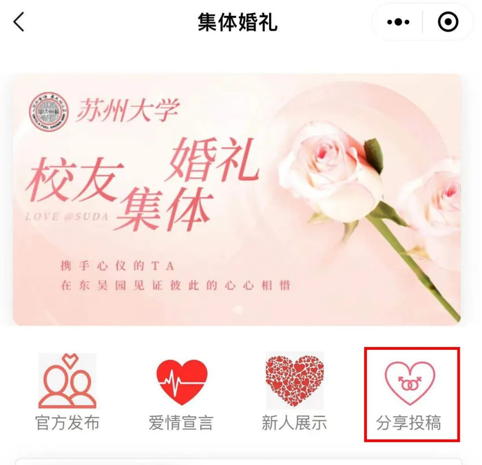 1.进入“苏州大学校友服务平台”小程序,点击“集体婚礼”,点击“分享投稿”