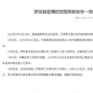 2022年1月26日20时,接省指挥部发出协查函,方某某为浙江杭州新冠病例确诊者的密切接触者,经初筛核酸呈阳性,现将方某某的行程轨迹公告如下: