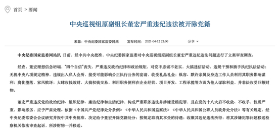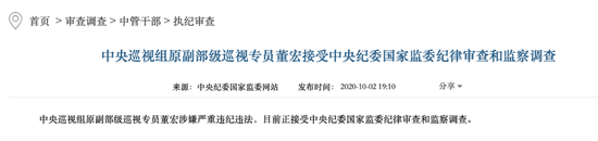 2020年10月,中央纪委国家监委官网发布消息称,中央巡视组原副部级巡视专员董宏涉嫌严重违纪违法,目前正接受中央纪委国家监委纪律审查和监察调查。