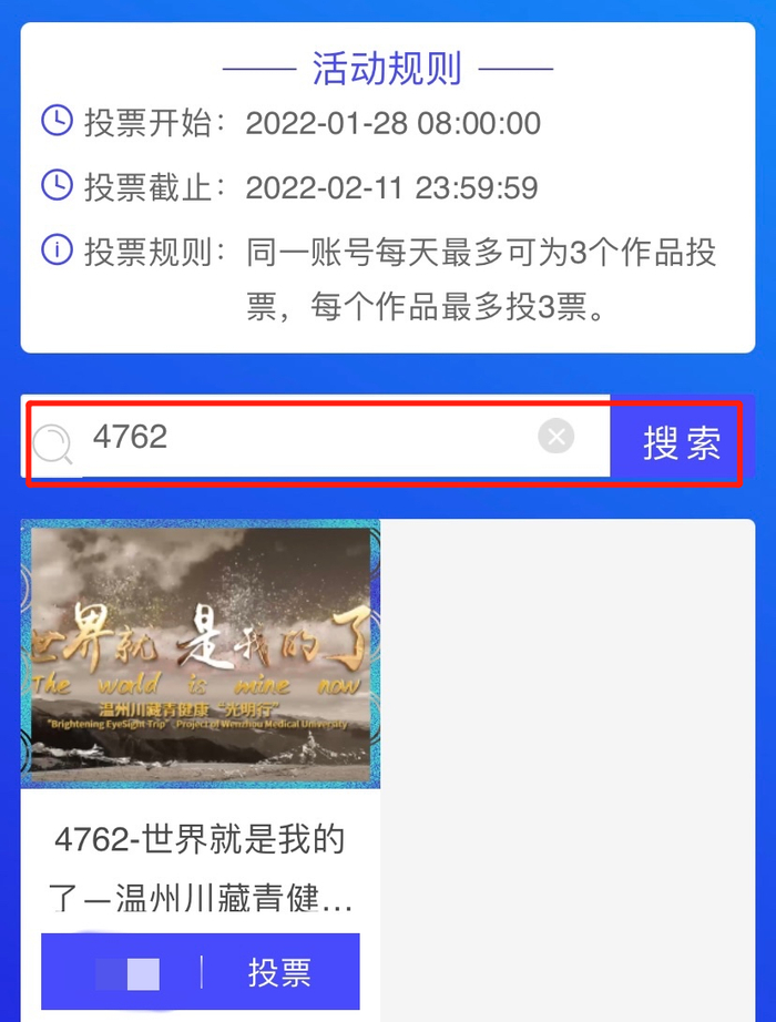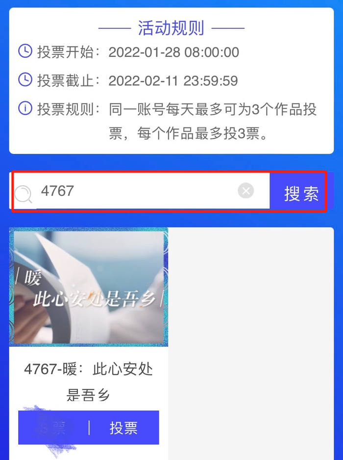Step2:进入页面,在搜索栏输入4762、4767选择投票即可(同一账号每天最多可为3个作品投票,每个作品最多投3票。)