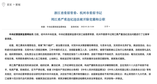1月26日,中央纪委国家监委官网发布消息称,周江勇被双开。