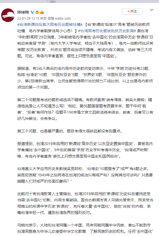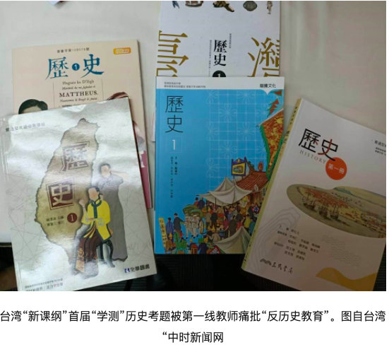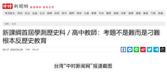 报道提到,台湾2019年启用的“新课纲”高中历史“以东亚史置换中国史”,曾被岛内学者痛批“去中国化”,3年后的首届“学测”历史学科考清末历史、“台湾戒严时期”等,有岛内学者直言“感觉上只想负面呈现中国史和国民政府”。