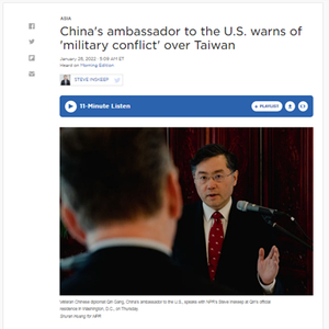 据中国驻美国大使馆网站1月28日消息,1月27日,中国驻美大使秦刚接受美国全国公共广播电台(NPR)“早间新闻”(Morning Edition)节目主持人英斯基普(Steve Inskeep)采访,就北京冬奥会、中美关系、台湾问题、涉疆问题等回答提问。经该台编辑的采访部分内容于当地时间1月28日上午播出。