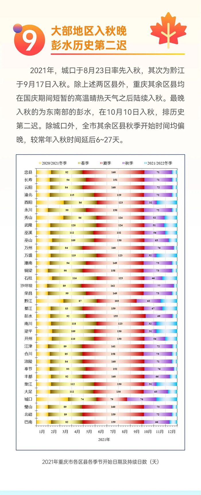 谭畅介绍,2019年以来,铜梁区、巫山县、石柱土家族自治县、云阳县龙缸国家地质公园、奉节县、万盛经开区黑山旅游度假区、沙坪坝区、武隆区和梁平区等9个地区或景区成功创建“中国天然氧吧”。此外,全市还有3个地区、3个农产品获评“中国气候宜居城市(县)”“中国气候好产品”等国家气候标志。