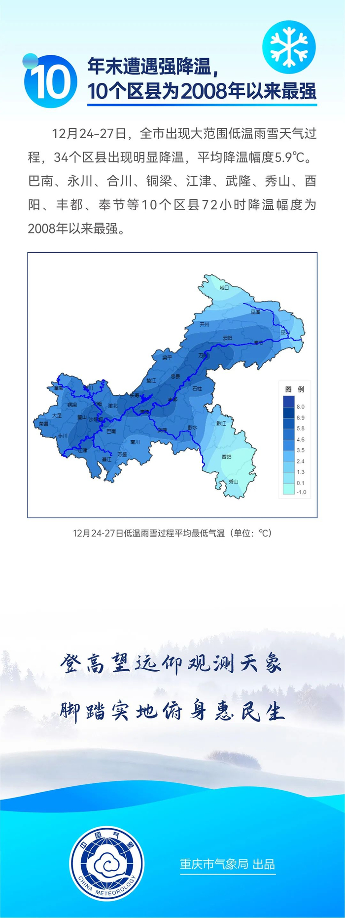 针对春节假日天气情况,有些什么注意事项呢?谭畅表示,春节假日重庆总体多阴雨雪,将出现持续低温阴雨天气,高海拔地区将出现雨夹雪或小到中雪,局地大到暴雪,山区有冰冻,市民朋友们需要注意防范积雪、路面结冰、低能见度、路面湿滑等对春运、道路交通和生产生活的不利影响,同时还需防范低温寡照和冻害对农业的不利影响。