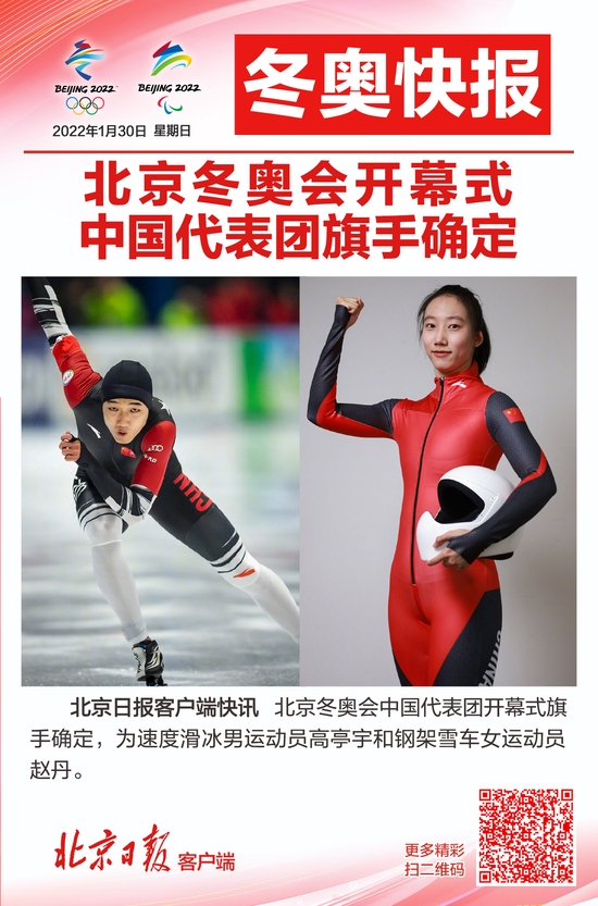 北京时间今天上午,中国代表团确定了北京冬奥会开幕式两名旗手,他们是男子速滑运动员高亭宇和钢架雪车女运动员赵丹。
