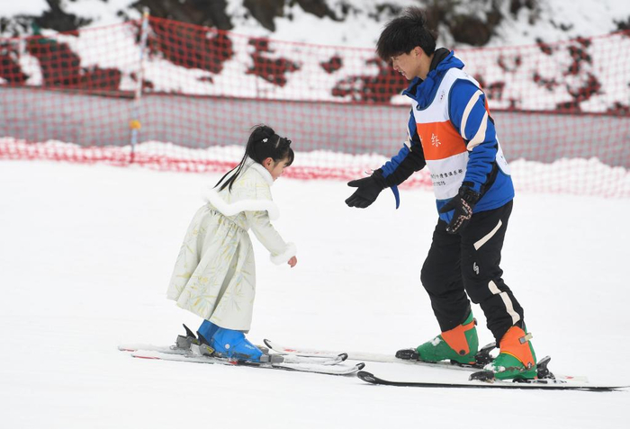 1月27日,在重庆石柱冷水国际滑雪场,小朋友在教练指导下练习滑雪。新华社记者王全超摄