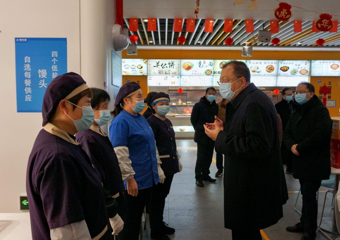 每到一处,校领导都与在岗职工亲切交谈,询问他们近期的工作安排,并对他们在疫情期间“舍小家为大家”的敬业奉献精神,“先集体后个人”的胸怀表达了敬意,感谢他们为交大疫情防控和各项工作作出的贡献。希望大家继续守好岗、履好职、尽好责,在做好疫情防控工作的同时,全力以赴保障春节期间校园安全、医疗、饮食等各项工作。