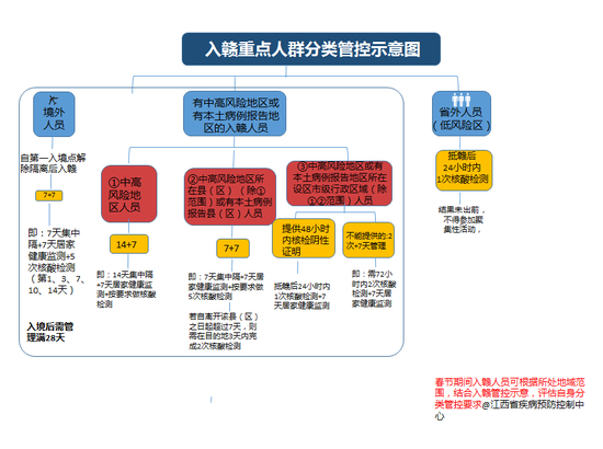 五、相较2022年1月30日,从1月31日起,各地对天津市津南区、黑龙江林口县和肇东市、贵州安顺市来(返)赣人员按低风险地区人员管控要求实施。