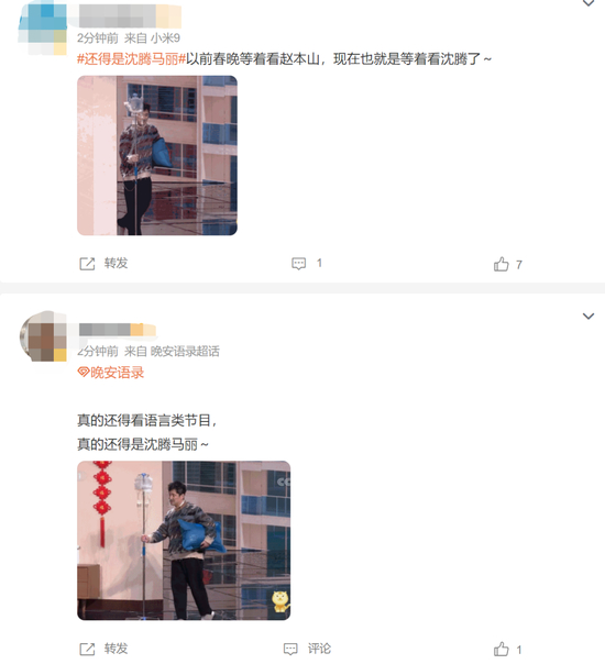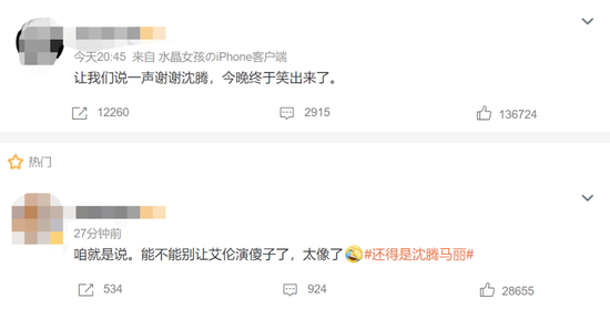 在小品结束后,“还得是沈腾马丽”登上了微博热搜榜第一位,热度达到1229万,成为今年春晚的“顶流”节目。