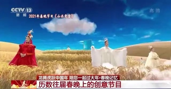 2021年春晚舞台上,时尚走秀节目《山水霓裳》华丽亮相,在高科技摄像技术和多媒体手段共同配合下,观众的视觉感官从一号厅舞台之外延展向祖国的山水林田湖,身临其境般地感受自然之美、大地之美、人文之美。伴随着李宇春的歌声,张梓琳、何穗、奚梦瑶和四十多位模特款款走来,在五分钟的时间变幻展示59套国风华服,表达着丰富的春节文化内涵,现场通过20次的舞台机械升降,将演员与虚拟现实特效完美组合,达到天衣无缝的效果。
