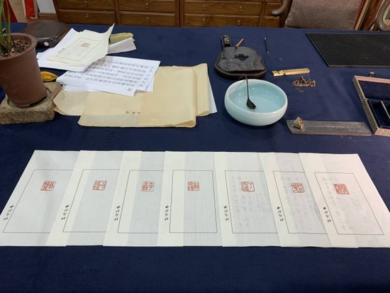 原来,传统篆刻艺术是以篆书入印,她在创作时需要思考,如何让简化字印章能呈现出篆刻艺术的美感。最终,她选择用楷书融入隶书笔意来呈现,让字体更加入古,又用刀敲打边框使之残破,营造金石感,以更贴近篆刻艺术。同时,她还以魏晋小楷的风格掺入宋徽宗瘦金体的用笔来表现书法作品,体现宋代的韵趣。