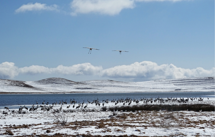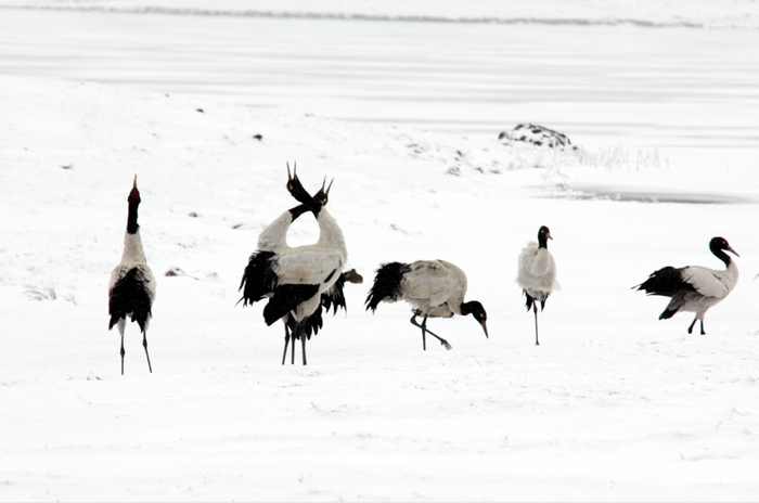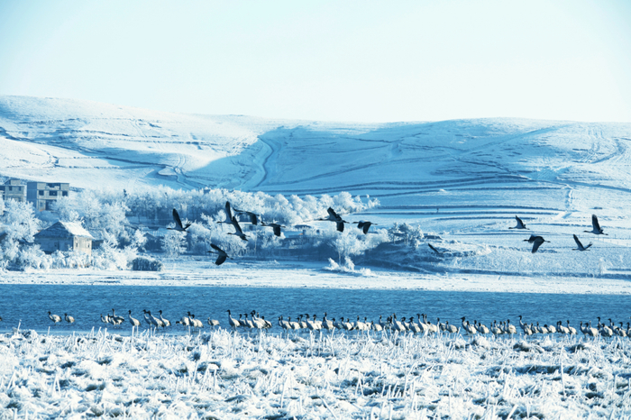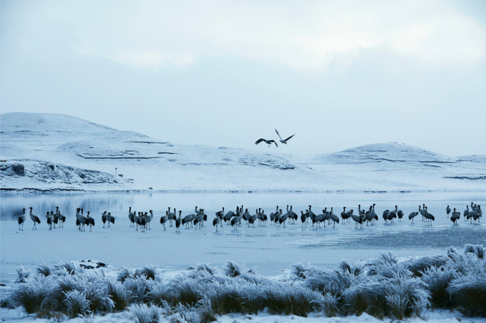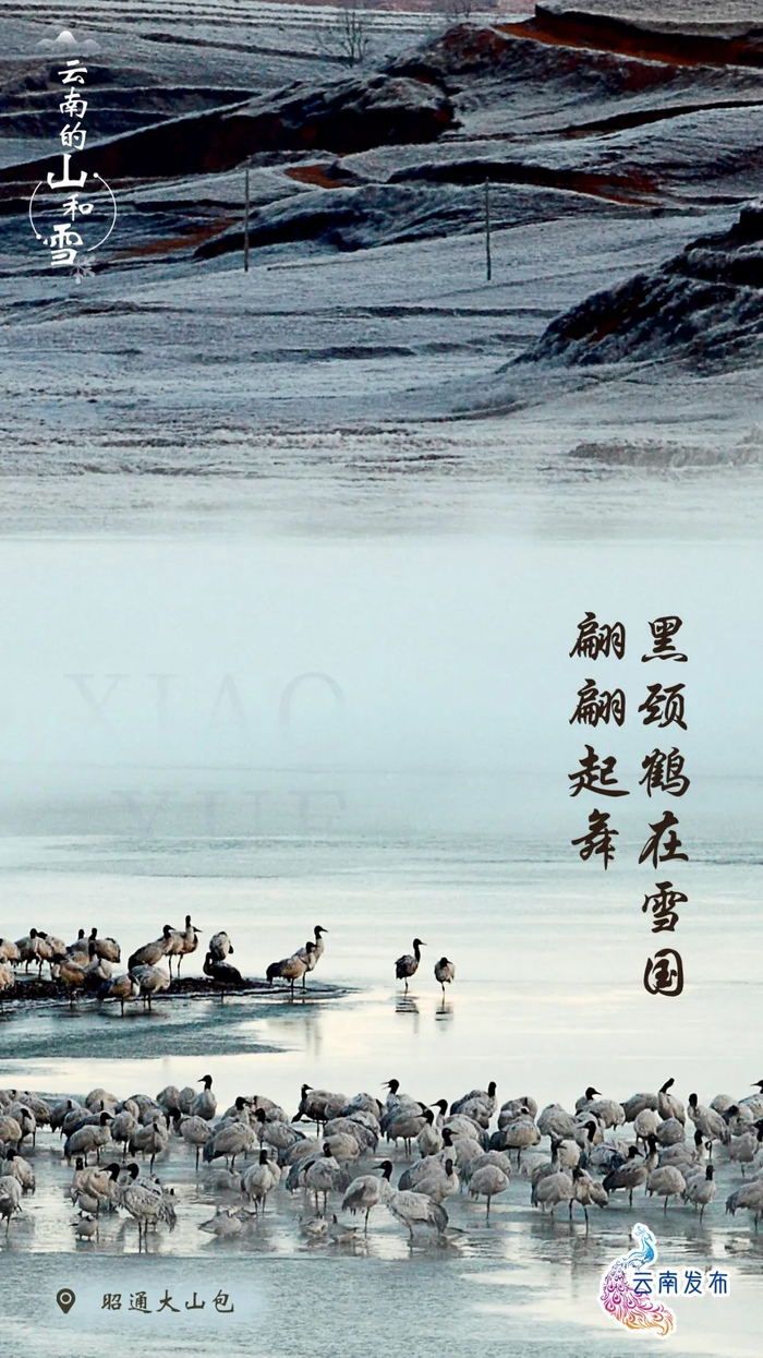 黑颈鹤踏雪,形如水墨画。冬天临近,如果你在冬天不小心闯入大山包,会恍然觉得走进了人间天堂,日出、夕阳,云海,黑颈鹤……