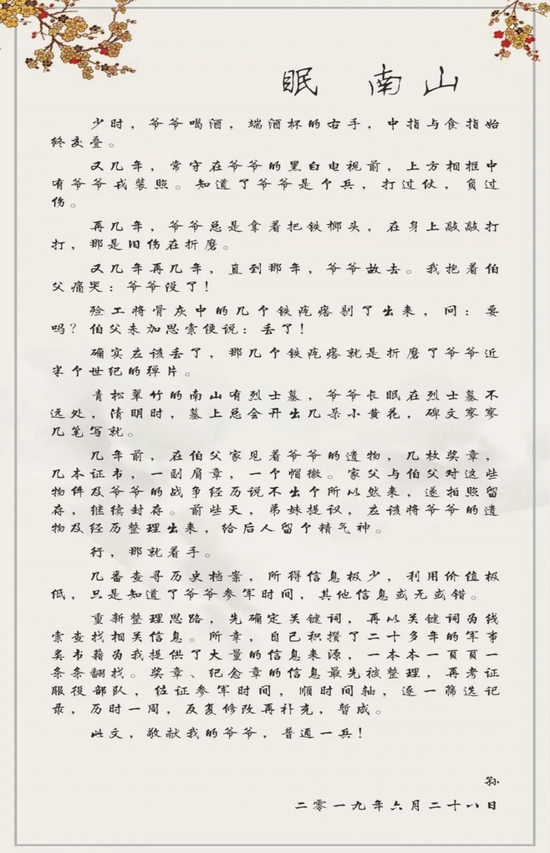 他说,爷爷只是一名普通的中国人民志愿军,是新中国千千万万枚奠基石中的一枚,分享资料,是为了让后人知晓这一段不可磨灭的历史。