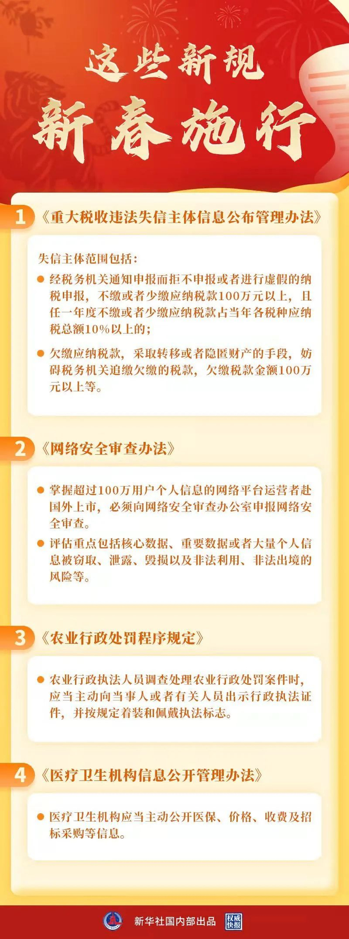 虎年新春,一批重要新规开始施行,欠税逾百万元或被纳入重大税收违法失信主体、加强对网络平台赴国外上市的网络安全审查、医疗卫生机构应当主动公开招标采购等信息……不断完善的法治,让新的一年更加“虎虎生威”。(资讯来源:新华社)