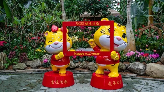 “福虎生威”年宵花展由生肖植物、年宵花卉和节庆花艺三部分组成,以与“虎”相关的特色植物为主元素,辅以蝴蝶兰、彩叶凤梨、三角梅、朱顶红、大花蕙兰、彩色马蹄莲、粉花酸脚杆和黄水仙等各种年宵花卉,通过花艺组景、单体盆栽展示等形式渲染热闹喜庆的春节氛围。