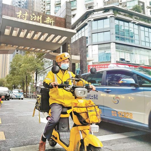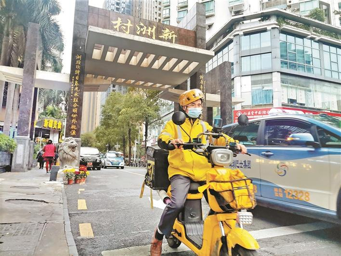 外卖骑手在新洲村繁忙配送。