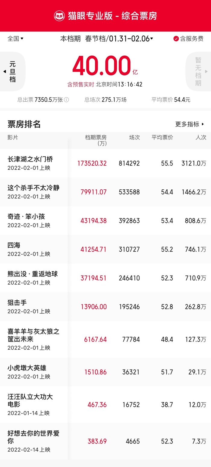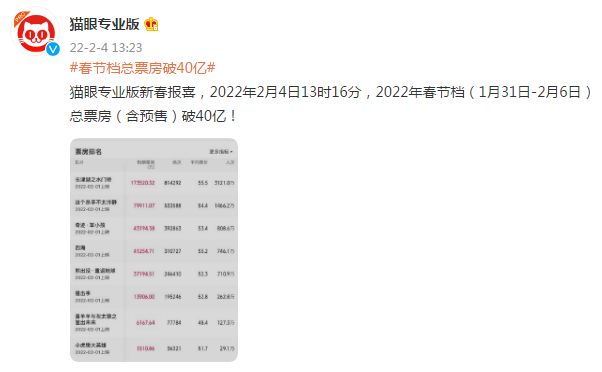 [环球网报道]据猫眼专业版统计,截至北京时间2022年2月4日13时16分,2022年春节档(1月31日-2月6日)总票房(含预售)破40亿!