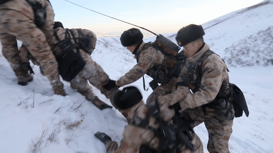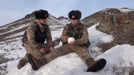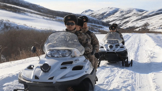 边防官兵在巡逻路上雪雕“冰墩墩”