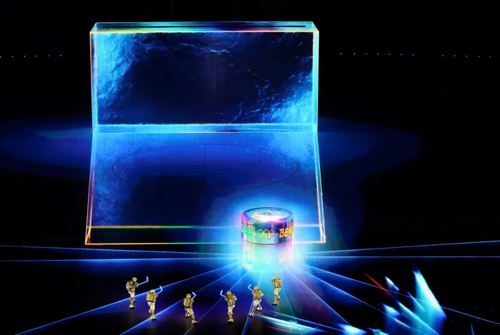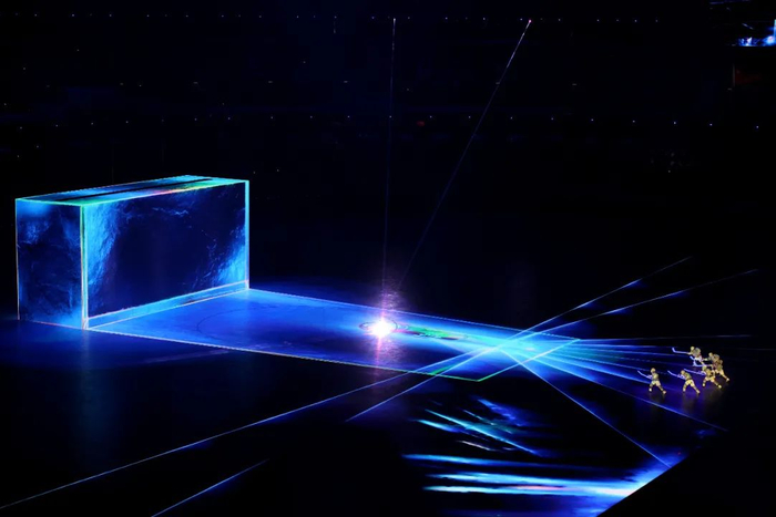 一方巨大的水从冰面缓缓升起,凝固成冰。过往23届冬奥举办城市的历史,随着环绕全场的24道“激光刻刀”的雕琢闪回其上,最终定格为“2022中国北京”。