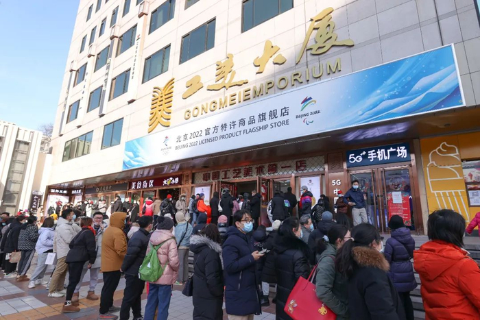 据新京报,2月4日,位于王府井工美的冬奥旗舰店迎来摩肩接踵的顾客,大家要排队两三个小时,才能进店购买到心仪的冬奥特许商品。