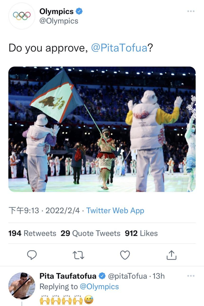 [环球网报道 记者 侯佳欣]2月4日,北京冬奥会开幕式在“鸟巢”国家体育场举行。开幕式上,赤裸上身、身上涂满椰子油的美属萨摩亚代表团旗手一亮相,就吸引了场内外观众的目光,并迅速成为当天最火爆的话题之一。在一片讨论声中,不少人想起了另一位“赤膊小哥”,国际奥委会官方推特更是直接@了他。