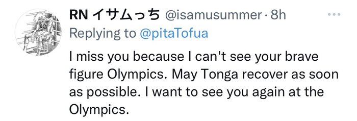 有网友写道:“愿汤加早日恢复。我希望能在奥运会上再见到你。”↓