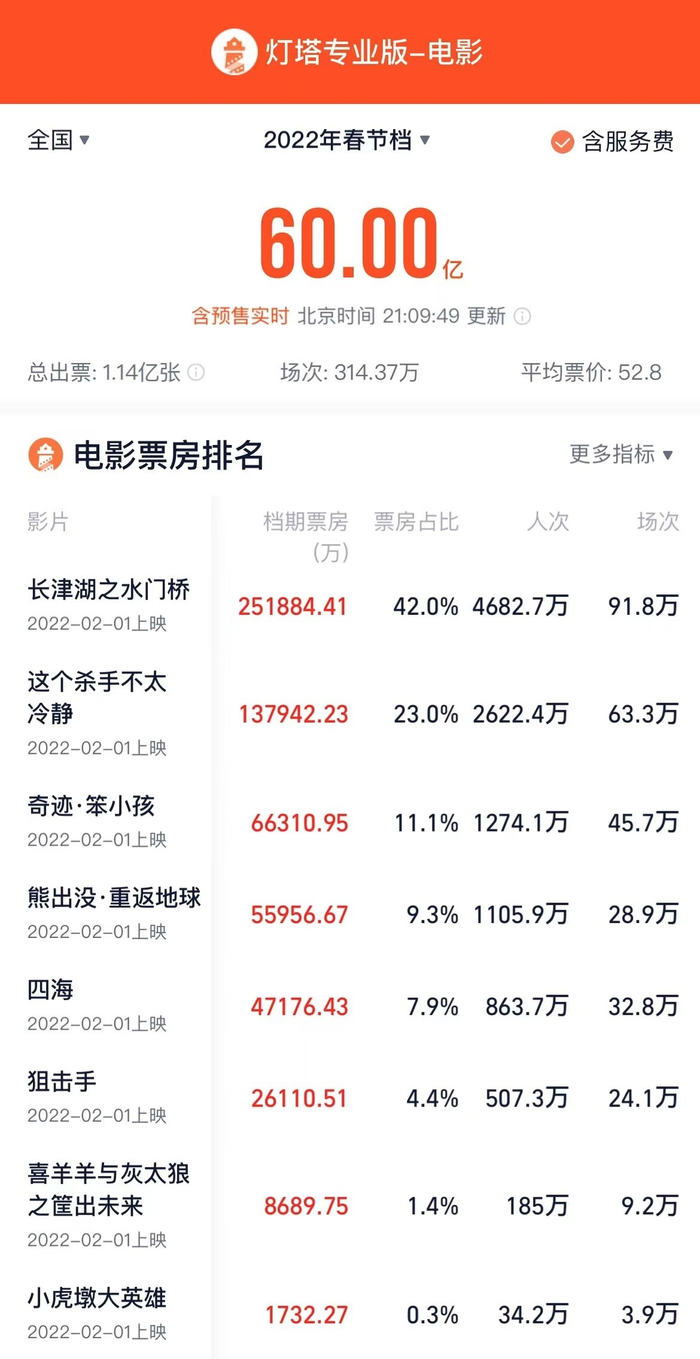 据灯塔专业版,截至2月7日0时,2022春节档(1.31-2.6)总票房报收60.25亿元