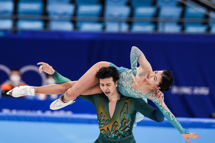 音乐响起后二人动作进行的十分流畅,完成了单脚连续步之后前5个动作完成后累计到37分,第七个动作是直线托举和旋转托举,两个动作衔接得很精美,接下来是一套编排的旋转,最后编排后的转滑进入尾声,技术总分57.41分,节目内容分49.77分,总分107.18,中国队拿到了6分团体赛,高于日本队的6分,加拿大、俄罗斯奥委会和美国分别拿到了8分、9分和10分。