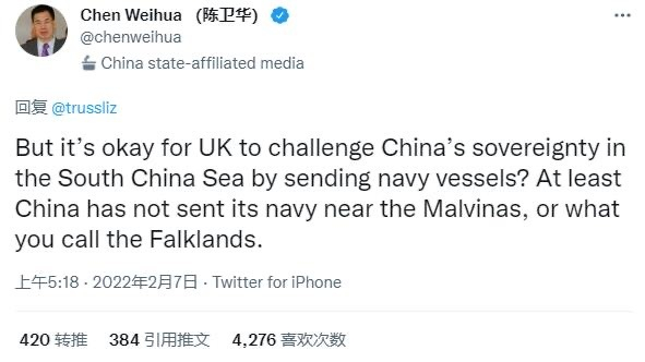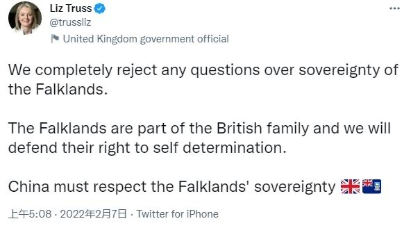 看到联合声明中的中方表态,英国外交大臣特拉斯7日急忙在社交媒体推特上发文,宣称“我们完全拒绝任何有关福克兰群岛主权的疑问,福克兰群岛是英国大家庭的一员”。特拉斯还用强硬语气对中国提起要求,声称“中国必须尊重该岛主权”。 特拉斯的推文受到不少关注,在推文下面的评论中,中国日报社欧盟分社社长陈卫华对特拉斯的一个反问得到了超过4000个点赞,陈卫华问道:“但是,英国就可以派军舰来挑战中国在南海的主权吗?至少中国还没有派海军去马岛附近,或者你所说的福克兰群岛。”
