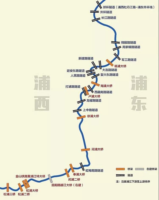 为方便市民过江,一条条交通大动脉在黄浦江下延伸。盘点一下黄浦江下已建成的17条越江公路隧道,自北向南依次是:郊环隧道、外环隧道、长江路隧道、翔殷路隧道、周家嘴路隧道、军工路隧道、江浦路隧道、大连路隧道、新建路隧道、延安东路隧道、人民路隧道、复兴东路隧道、西藏南路隧道、打浦路隧道、龙耀路隧道、上中路隧道、虹梅南路隧道。