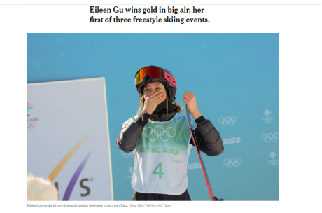 “谷爱凌在自由式滑雪女子大跳台项目中夺金,这是她三个自由式滑雪项目中的第一枚金牌。”《纽约时报》报道了她的夺冠经过,并对谷爱凌的成长经历和家庭背景做了简要介绍。