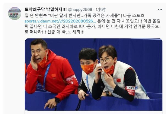 [环球网报道]中国选手任子威、李文龙7日晚包揽北京冬奥会短道速滑男子1000米决赛金、银牌。而被韩国人寄予厚望的韩国选手黄大宪和李俊书当天均因被判罚犯规而被取消决赛资格。此前,中国队还在短道速滑项目混合团体接力决赛中夺得冠军。在视短道速滑为传统强项的韩国目前依然颗粒无收,一些网友随即把矛头对准了曾经的韩国短道速滑传奇明星、后加入俄罗斯籍、现担任中国队技术教练的安贤洙。据韩国《朝鲜日报》8日消息,安贤洙8日凌晨在社交媒体上发布长文称,家人受到伤害是他现在最痛苦和最艰难的事情,拜托大家不要对其家人进行无差别的辱骂或恶意留言。