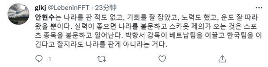“安贤洙没有出卖过国家,只是抓住机会努力,运气好而已。如果(个人)实力出众,无论其他什么国家、什么体育项目都会抛来橄榄枝。即使朴恒绪教练(越南队韩国籍主帅)率领越南队战胜韩国队,也并非出卖国家。”