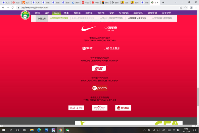 中国足球协会的官网显示,以“中国之队合作伙伴”身份出现的赞助商有9家,其中耐克和中国平安的身份是“高级合作伙伴”,蒙牛和中免集团是“官方合作伙伴”,怡宝是“官方饮用水合作伙伴”,IC photo是“官方图片合作伙伴”,晓琴海参、狮跑锐得、朋来制药等3家的身份为“官方供应商”。在女足的官方感谢名单里,以上9家均有出现。但之前的签约消息显示,小琴海参和狮跑锐得的主要赞助对象是男足,但在官网中,男足的赞助商名单中被单列的只有海澜之家。