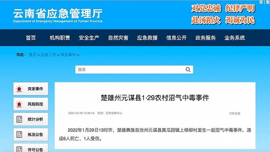 云南元谋县发生一起沼气中毒事件,致6死1伤 界面新闻 界面新闻官方账号 02月09日10:50 关注 听新闻 原标题:云南元谋县发生一起沼气中毒事件,致6死1伤 据云南省应急管理厅2月9日消息,1月29日13时许,楚雄彝族自治州元谋县黄瓜园镇上棋柳村发生一起沼气中毒事件,造成6人死亡、1人受伤。