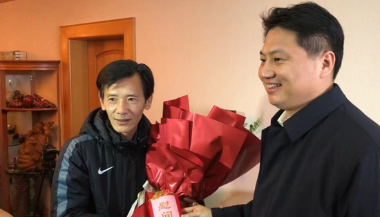 姜冬冬向王嘉明送上了鲜花和慰问金。在与水庆霞视频连线时,姜冬冬说,“首先祝贺中国女足获得亚洲杯的冠军啊,当然也祝贺水指导是以主帅和队员的身份,双双捧起亚洲杯的第一人。”