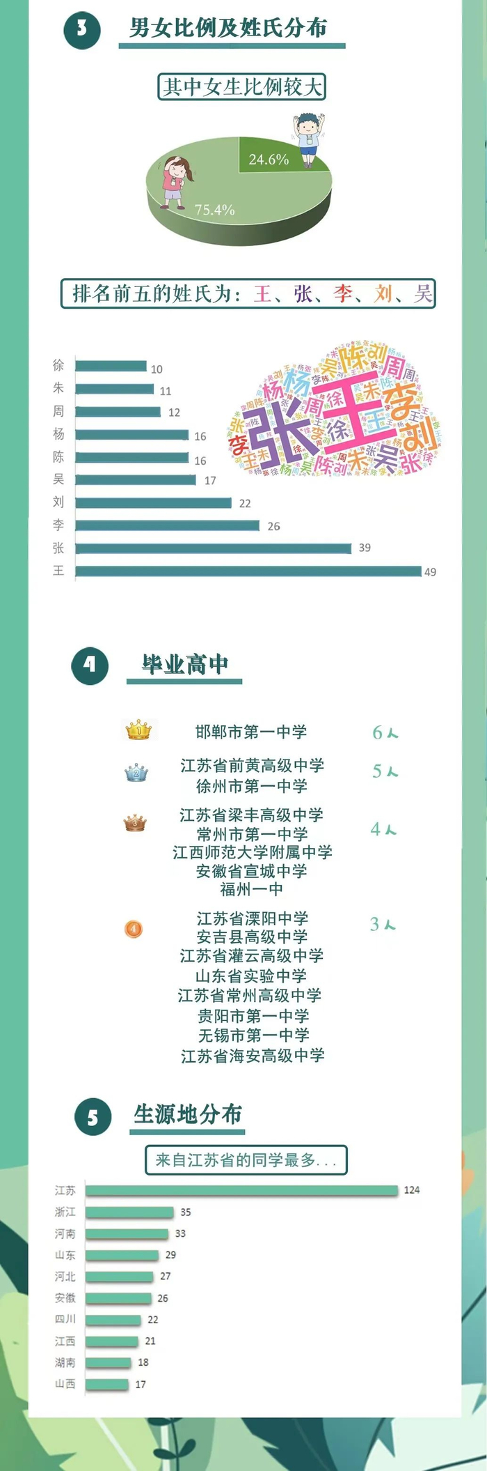 保研同学的男女比例为1:3,来自江苏的同学占比最大(124人,占比25%),高中毕业于邯郸市第一中学的同学最多(6人),其次是江苏省前黄高级中学(5人)和徐州市第一中学(5人)。