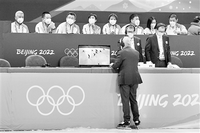 2月5日,北京2022年冬奥会短道速滑混合团体接力半决赛赛后,裁判员正在确认成绩。(图片来源:视觉中国)