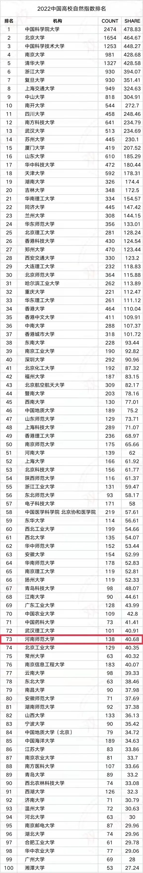 2022年2月7日,Nature Index公布了2020年11月1日-2021年10月31日全球自然指数学术机构排名。我校连续进入全球自然指数中国高校百强榜单,位居全球高校第316位、中国高校第73位、全国地方师范大学第4位、河南省高校第3位。全省共有郑州大学、河南大学、河南师范大学3所高校进入中国高校前100强。
