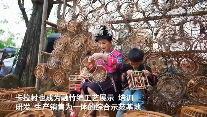 贵州省丹寨县龙泉镇卡拉村是一个苗族聚居的民族村寨,也是远近闻名的“鸟笼编织专业村”。近年来,村民们把竹编工艺从单一的鸟笼产品,转变成以鸟笼造型为基础的灯具、灯笼、家居用品等多样化竹编产品,既保留了传统鸟笼造型特色,又拓展了产品市场。卡拉村也成为融竹编工艺展示、培训、研发、生产销售为一体的综合示范基地。