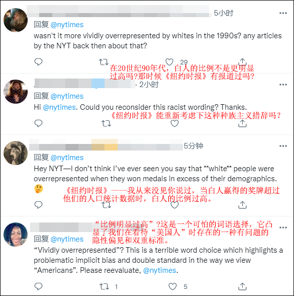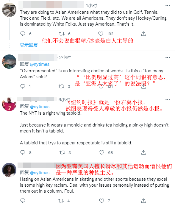 这番言论引发众多美国网民的不满,直言《纽约时报》种族歧视,“‘比例明显过高’这个词很有意思,是‘亚洲人太多了’的说法吗?”“白人比例过高时,也没见你们报道过。”