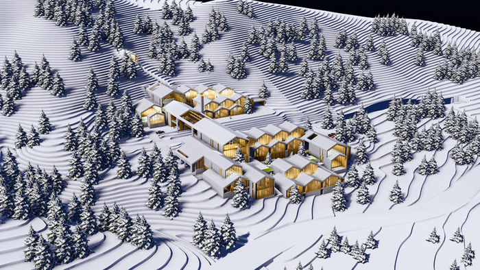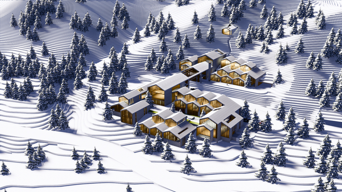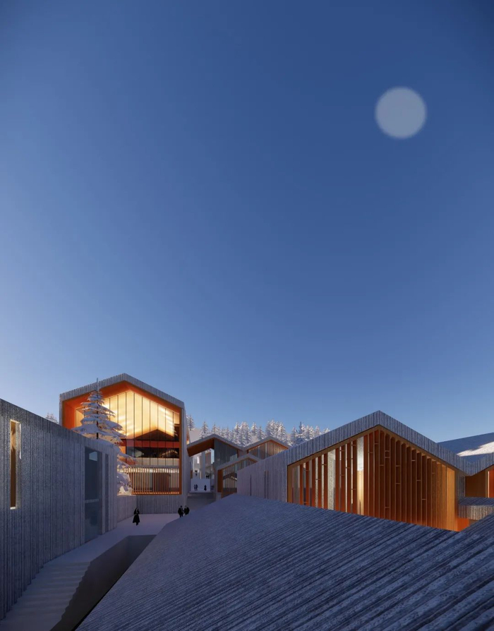 设计方案以连续的折板屋面与崇礼自然山势形成呼应,并以严谨的模数控制在自然中找到定位。通过层层退叠和化整为零的建筑体量处理,将14000㎡的建筑融入自然生境之中,并充分契合了坡地的地形特征。