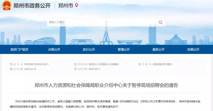 通告称,为避免大规模人群聚集,有效保护群众身体健康,根据《传染病防治法》《突发公共卫生事件应急条例》、郑州市新冠肺炎疫情防控指挥部有关要求,决定暂停现场招聘会,全面推行网上办、预约办,有关事宜通告如下: