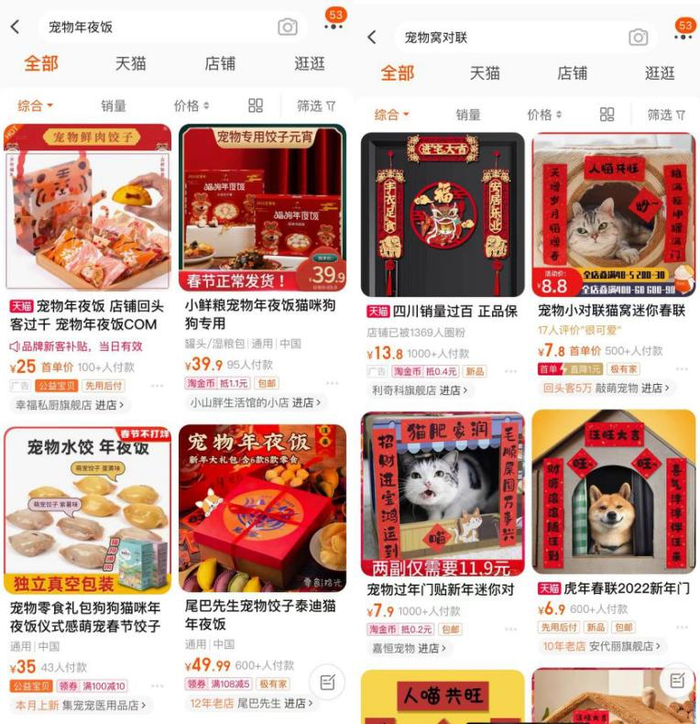 今年春节期间,宠物年夜饭、宠物对联等产品在电商平台也非常火爆,以宠物年夜饭为例,价格在几十上百元不等,最高则近千元。
