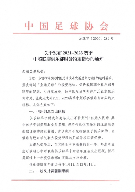 随后在12月26日,中国足协下发了第一份“限薪令”——中超联赛财务约定指标,其中涉及到球员薪酬方面的,国内球员在2019年11月20日之后签订的合同为新合同,税前顶薪不超过1000万人民币,入选国家队球员上浮20%。外籍球员在2020年1月1日之后签订合同为新合同,新签工资不得超过税后300万欧元。